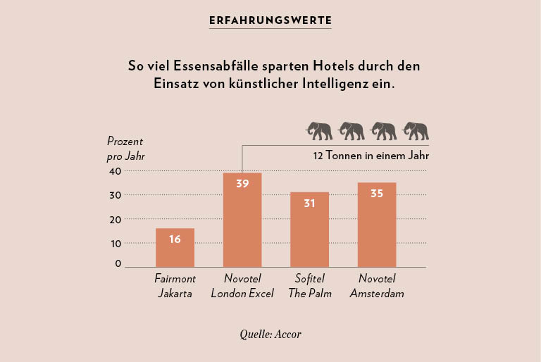 Aktuell nutzen rund 300 Accor-Hotels weltweit die KI-basierten Lösungen Winnow und Orbisk. Beide Systeme scannen und erkennen überschüssige Lebensmittel und ermitteln detaillierte Daten über Menge und Art der Essensabfälle. Auf Basis dieser Daten werden Menüs angepasst, um Food Waste zu verringern.