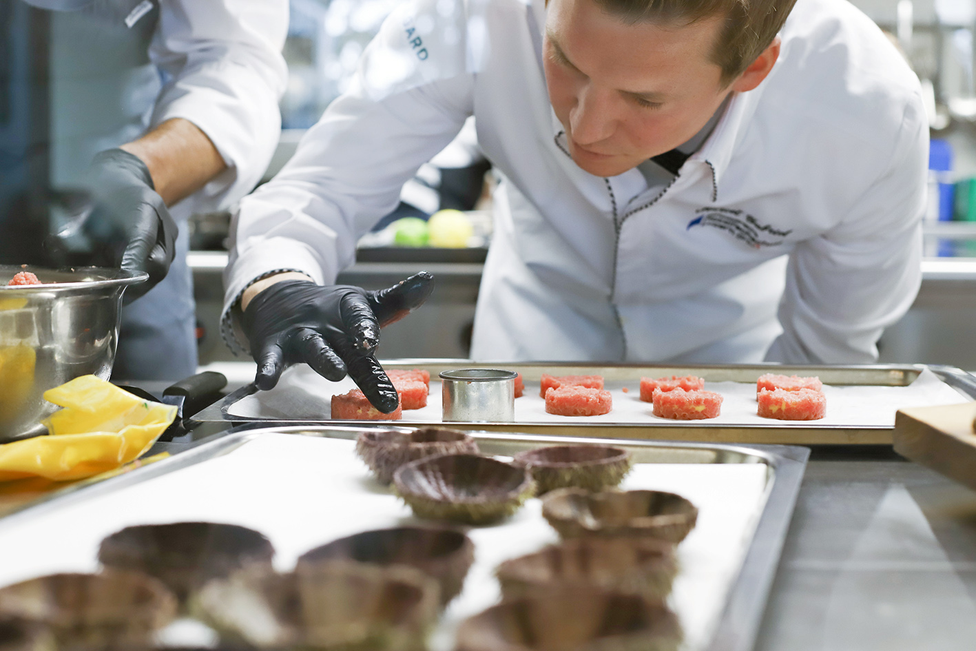 Der Schaumwein aus Xarel-lo-, Macabeo- und Chardonnay-Trauben in Demeter-Qualität war nach der zweiten Gärung in der Flasche fast fünf Jahre auf den Feinhefen gereift. 47 Teams nahmen die Herausforderung an. Zehn standen sich im Final in der SHL-Küche gegenüber. Zehn Juroren, darunter Antonio Colaianni und Beat Caduff sowie F&B-Direktor der SHL Silvio Tschudi, bewerteten die Leistung der Küche und das Zusammenspiel mit dem Gramona Imperial. Steffi und Philipp Heid lieferten als Erste. Ihre Kombination aus Jakobsmuschel, Kohlrabi, Apfel und Koriander war ein perfekter Match und legte die Messlatte hoch. Es folgten neun grossartige Kompositionen, zum Teil aufwendig in Präsentation und Zubereitung. Die Juroren wurden gefordert. Resultate finden Sie in der Bildlegende.