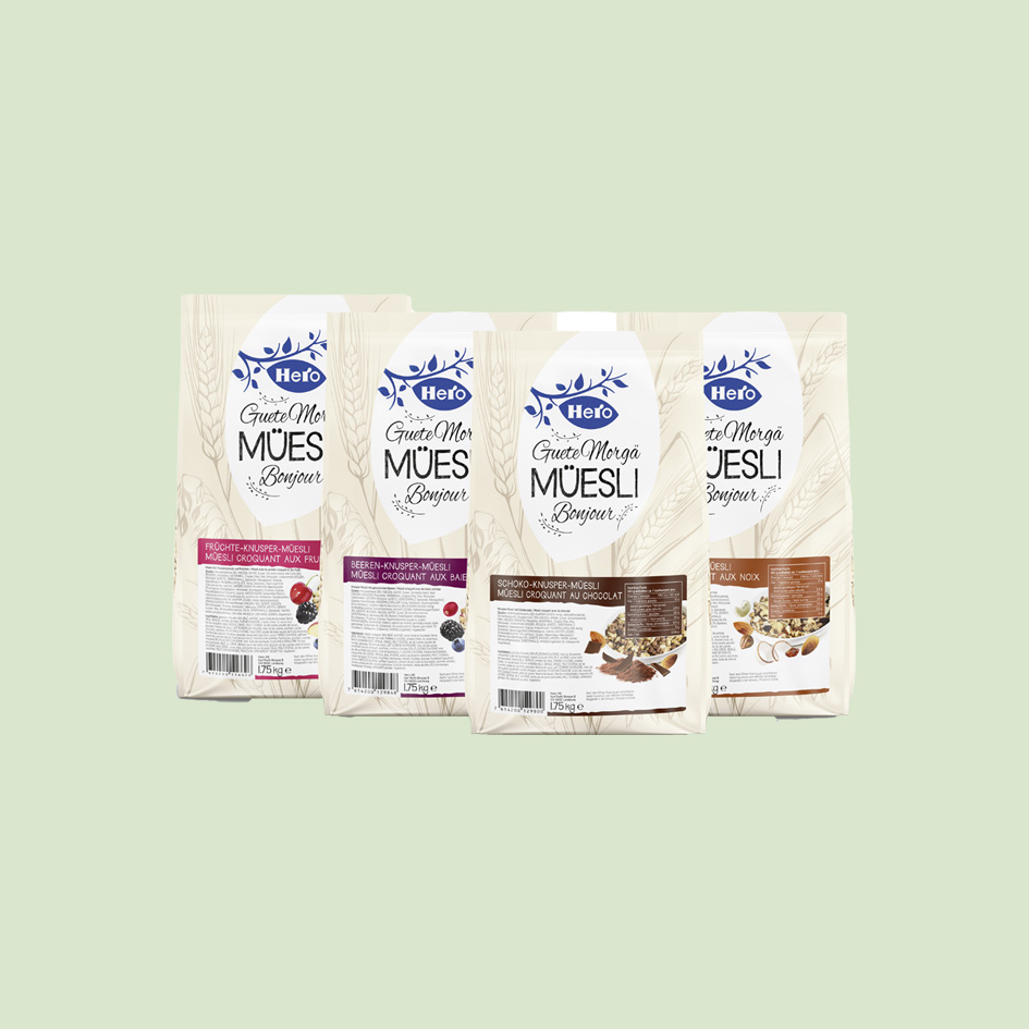 Eine Auswahl an verschiedenen Müeslimischungen sorgt für mehr Abwechslung auf dem Frühstücksbuffet. Hero Gastronomique hat drei neue Sorten des beliebten Hero Knusper-Müesli im Angebot: Beeren, Nuss und Schokolade.