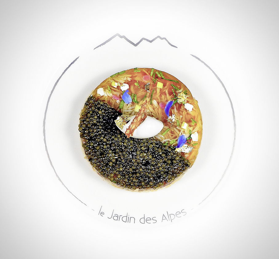 Sa nouvelle carte slalome entre les terroirs helvètes et le grand répertoire classique. Par exemple? Une féra déclinée en bonbons aux arômes de gruyère, crème double et racine de cerfeuil, un bar de ligne cuit en croûte de sel de Bex, une royale de foie gras, cèpes au poivre de Timut, caviar impérial. Une cuisine élégante, fraîche et raffinée, servie dans l’écrin étrangement luxueux renommé le Jardin des Alpes, serti au cœur d’un ensemble de chalets cosy. Une cuisine festive et pleine de verve qui tiendrait peut-être à ses origines champenoises.