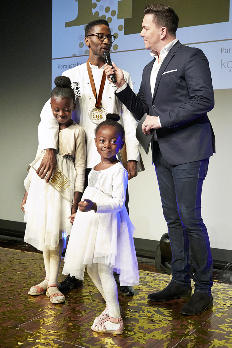 Grosse Emotionen am diesjährigen SCC-Final: Sieger Mukoma Euloge Malonga holt seine beiden Töchter auf die Bühne, drückt sie an sich und stemmt im nächsten Augenblick den Pokal triumphierend in die Höhe. Er, der mit sieben aus dem Kongo in die Schweiz kam und im Inselspital in Bern unter Georges Knecht Koch lernte, ist an diesem Mittwoch im September 2019 mit 35 Jahren ein Schweizer Champion. In der Geschichte des Swiss Culinary Cups gibt es immer wieder berührende Momente. Der Sieg eines Manuel Baumann etwa, der sich beim Kochen fast den Finger abschnitt und am Ende trotzdem gewann. Und eben die Geschichte des wettbewerbsunerfahrenen Mukoma Euloge Malonga, der sich für viele überraschend zum Sieg kochte.
