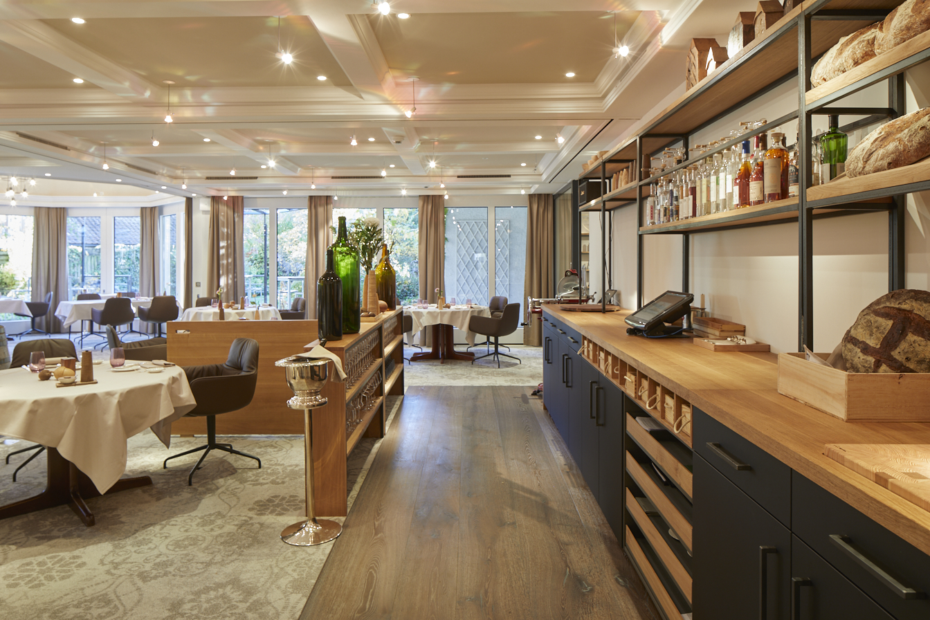 Wo früher das Restaurant «Szenario» mit Gelb- und Blautönen dominierte, ist mit dem neuen «Zeitgeist» eine stilvolle, dezente Farbgebung eingezogen, die die Philosophie der regionalgeprägten Küche noch besser zur Geltung bringen soll. Elegantes Eichenholz, zurückhaltende Farben in Braun- und Grautönen und ein Teppich in Vintage-Muster prägen nun das Interieur. Die Tischabstände sind grosszügiger geworden, was den Raum luftiger, das Ambiente aber trotzdem intimer wirken lässt – gerade in der aktuellen Zeit ein wichtiger Aspekt. Die neuen drehbaren Ledersessel sind äusserst bequem und laden zum Verweilen an.
