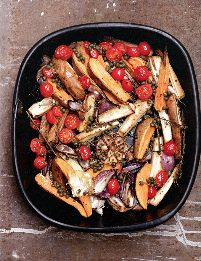 Den Backofen auf 190 °C vorheizen. Die Pastinaken schälen und in Spalten von 5 x 1,5 cm teilen. Die Zwiebeln schälen und in sechs Spalten schneiden. Mit Olivenöl, Kräutern und Knoblauch in eine ofenfeste Form geben, mischen und 20 Minuten backen. Süsskartoffeln ungeschält in Spalten schneiden, dazugeben, umrühren und weitere 40 Minuten backen. Die Tomaten dazugeben und weitere 10 Minuten backen. Das Röstgemüse aus dem Ofen nehmen und sofort mit der Kapernvinaigette übergiessen.