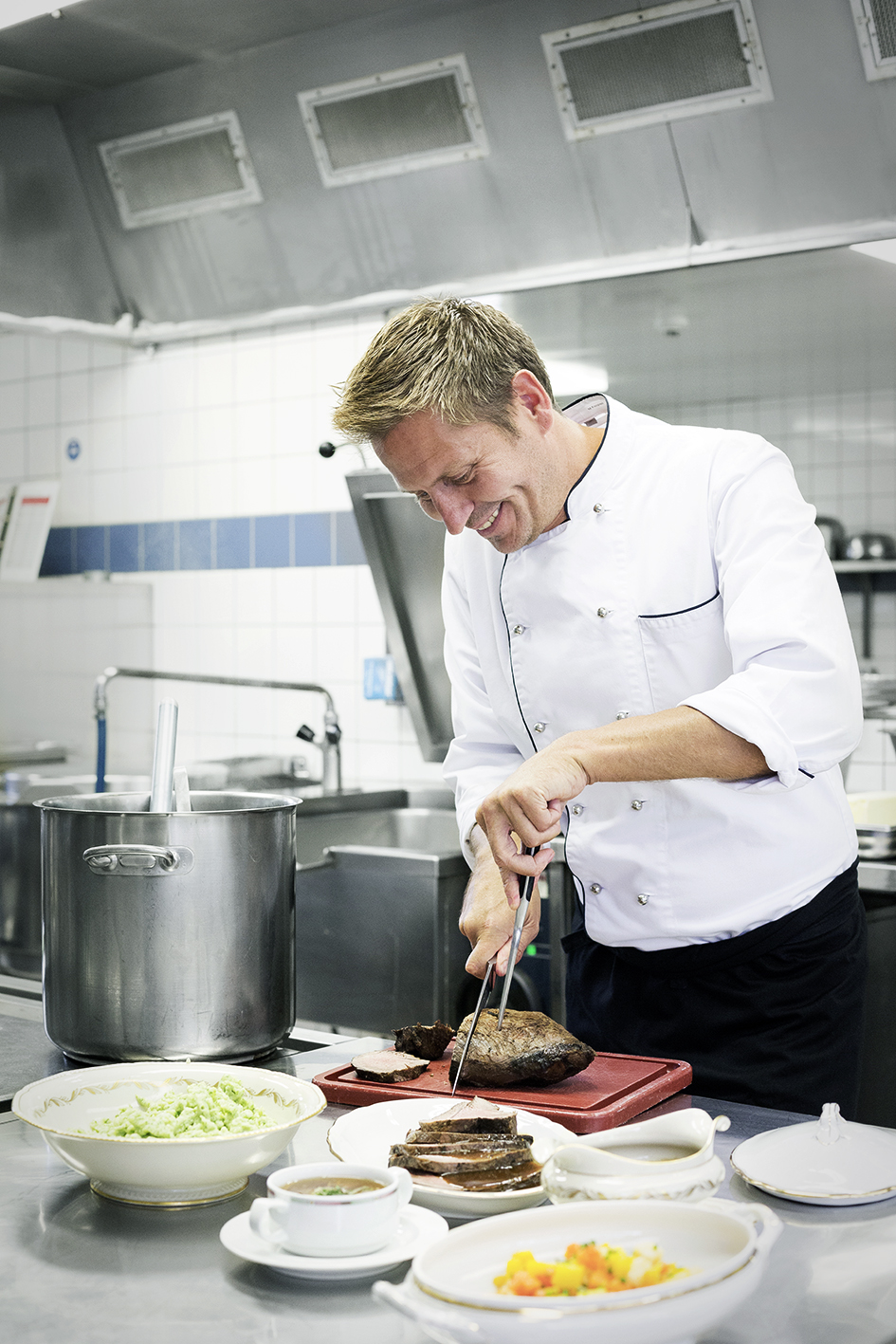 Marcus Kaspari fand sie im Alterszentrum Hofwiesen. «Beim Kochen besteht grundsätzlich kein grosser Unterschied», erzählt er, «mein Auftrag lautete von Anfang an, frisch und mit Schweizer Fleisch zu kochen. Knackiges Gemüse ist zwar kein Thema mehr – die Bewohner mögen es weichgekocht –, aber gut aussehen muss es trotzdem», schmunzelt Kaspari. «Anfangs war es herausfordernd, diesen Spagat hinzubekommen», meint er, «ich wollte die Hotellerie bewusst in die Allgemeinküche bringen. Deswegen habe ich nicht noch die Ausbildung zum Heim- und Spitalkoch gemacht.»