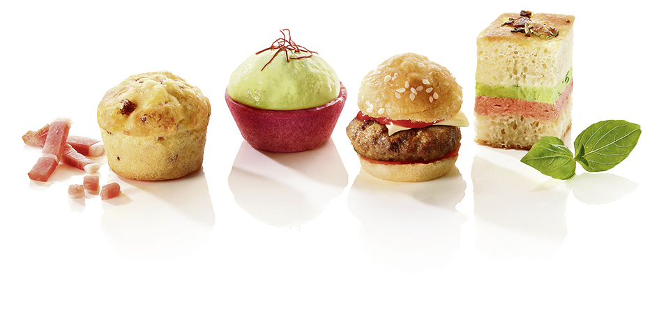Die süssen Petits Fours von Hug sind ein Erfolgskonzept. Diese in einer salzigen Variante zu präsentieren, ist die neueste Idee von Hug. Vier verschiedene Variationen der Apéro-Häppchen wurden kreiert: ein Speck-Muffin, ein mit Guacamole-Mousse gefülltes Randen-Tartelette, ein kleiner Hamburger sowie eine Focaccia. Die salzigen Petits Fours vermögen zu begeistern. Tiefgekühlt ange- liefert, sind sie innerhalb einer Stunde servierbereit.