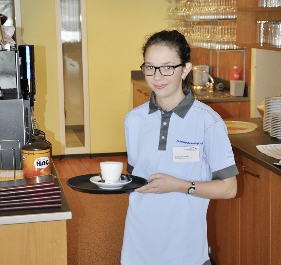 Stolz und mit überzeugend gespielter Routine balanciert Stefanie Kuonen den Espresso auf dem Tablett zum Tisch, serviert ihn und wünscht „zum Wohl“. Das Besondere: Die Frohnatur aus der Walliser Gemeinde Termen ist erst 14-jährig. Stefanie ist eine von 29 Glücklichen, die für die begehrten Plätze im Schnuppercamp ausgewählt wurden. Mehr als hundert Jugendliche aus allen Landesteilen haben sich beworben.