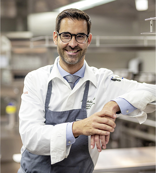 «In der Küche beginnt der Warenfluss, der sich wie ein roter Faden durch alle fünf Semester zieht», sagt Marc-André Dietrich, Culinary Director der SHL Schweizerischen Hotelfachschule Luzern. «Im ersten Semester erarbeiten sich die Studierenden viel Grundwissen über Produkte und deren Qualität. Sie bekommen strukturiertes Arbeiten und Organisieren vermittelt. Und mit der Berechnung von Rezepten legen sie eine Basis für die weiteren Semester.»