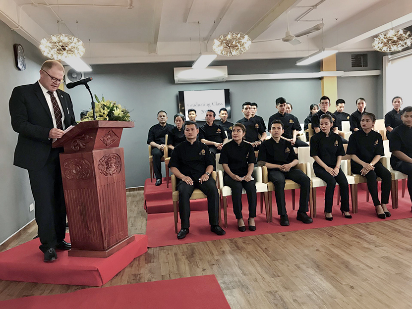 Es war ein historischer Moment an der Academy of Culinary Arts Cambodia (ACAC): Urs Masshardt, Stiftungsratspräsident der Schweizerischen Hotelfachschule Luzern SHL und Geschäftsleiter der Hotel & Gastro Union, gratulierte den ersten Absolventen der kambodschanischen Kochschule zum erfolgreichen Abschluss. Diplome und Blumen wurden überreicht, die Kochmützen der Feiernden flogen durch die Luft. Urs Masshardt: «Die Zeremonie wurde dem Ablauf der Diplomfeier an der SHL angelehnt und hochprofessionell durchgeführt. Ich war beeindruckt. Es waren Gäste aus der Politik dabei. Unter anderem waren der Vizepräsident von Kambodscha sowie die Ministerin für Bildung zugegen.»