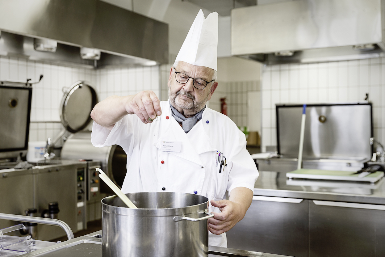 Und er kämpfte so hart, bis ihn der damalige Küchenchef im Jahr 1999 wieder ins Team holte. «Der erste Tag war witzig. Der Chef besorgte mir eine extra grosse Kartoffel – ich sollte sie schälen. Plötzlich gingen die Reflexe mit mir durch und ich warf sie nach hinten. Da merkten wir, dass ich lieber nur in der kalten Küche arbeiten sollte», erinnert sich Wagner. Nun passt er sich an, benutzt die kleineren Messer und arbeitet nicht mehr mit allzu vielen Schnitttechniken. Das Halten mit der linken Hand gestaltet sich schwierig, die Hektik und die Verbrühungsgefahr in der warmen Küche sind zu gross, er musste zurückstecken. 15 Prozent Arbeitsleistung erbringt er jetzt bei 50 Prozent Arbeitsaufwand. «Alles ist etwas langsamer geworden. Aber man muss schauen, dass man das Beste draus macht. Was bringt es mir, depressiv oder weinerlich zu sein?», sagt Wagner. Der Job hat ihm geholfen und Erfüllung gegeben. Trotzdem ist er froh, in drei Jahren in den verdienten Ruhestand zu gehen.
