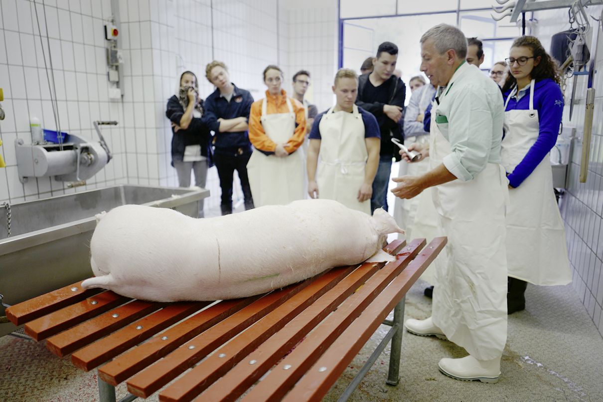 Es sind keine alltäglichen Bilder, welche die Studenten der Schweizerischen Hotelfachschule Luzern SHL zu Gesicht bekommen. Die einen treten einen Schritt zurück, andere nutzen die Gelegenheit, um den Profi auszufragen und das frische Schlachtgut anzufassen.