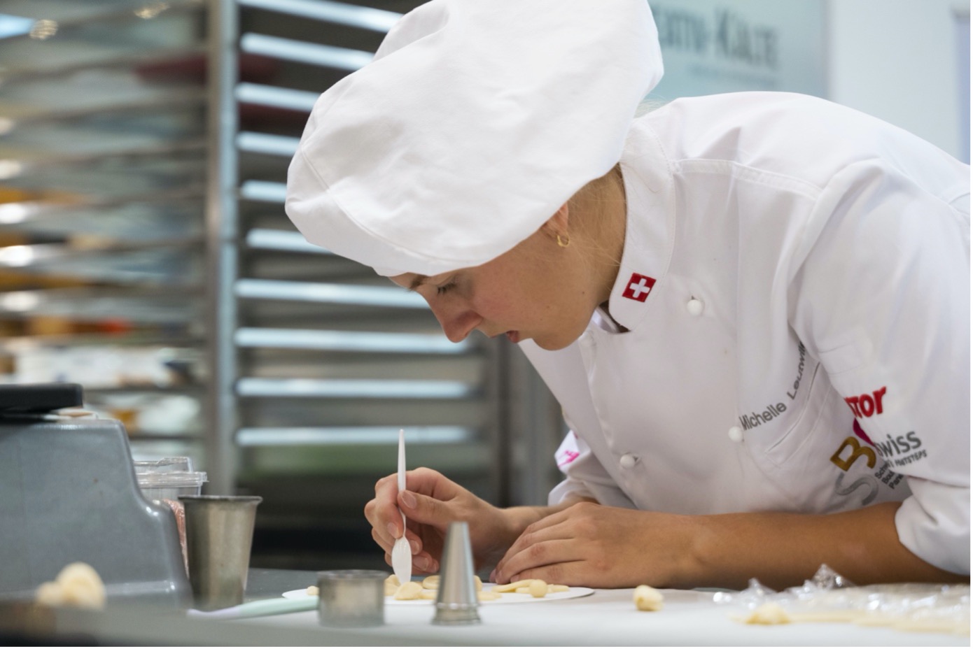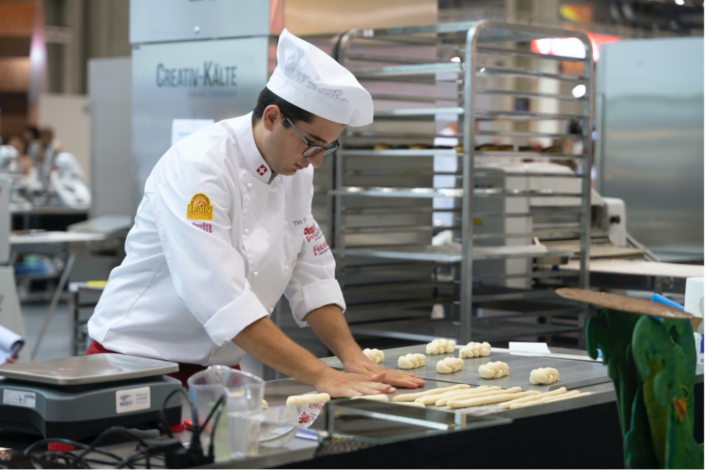 Bereits am ersten Wettkamptag zeigten die Wettbewerbsteilnehmenden der Bäckerei-Konditorei-Confiserie höchste Konzentration. Dieses Jahr stützen sich die Aufgaben der drei Berufe auf das Wettbewerbsthema «die vier Elemente – Wasser, Luft, Feuer, Erde».
