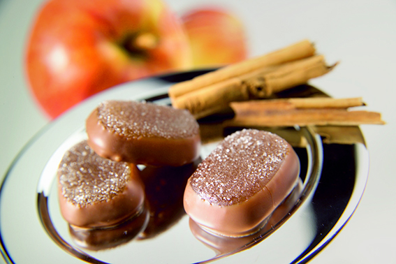 Apfelmus, Zitronensaft und Wasser erwärmen. Pektin mit Zucker mischen, beigeben und aufkochen. Restlichen Zucker und Glucosesirup beigeben und auf 104 Grad Celsius kochen. Am Schluss Zitronensäure beigeben und sofort weiterverarbeiten. Weizenstärke und Maisstärke mischen, in einen Kasten geben und Oberfläche glattstreichen. Mit Gipsstempel eindrücken. Gelee in die Einbuchtungen giessen und fest werden lassen. Nach dem Auspudern die Oberfläche mit Zucker überstreuen und bis zum Rand trempieren (in temperierte, flüssige Milchcouverture eintauchen).