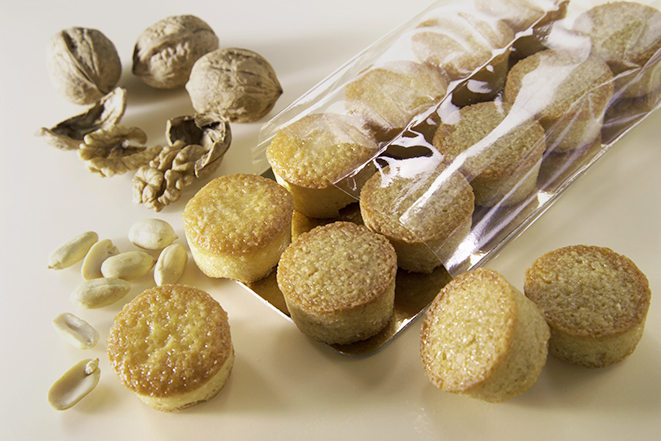 Erdnüsse und Zucker zusammen fein reiben. Eiweiss und Staubzucker beigeben und im Kupferkessel aufkochen. Heisse Butter und Weizenmehl beigeben. Jeweils 18 g Masse in Flexipanformen (zirka 4 cm Durchmesser und 2 cm Höhe) eindressieren. Pro Form à 50 Nutzen zirka 900 g. Diese Formen eignen sich sehr gut zum Backen, da nichts kleben bleibt. Sollte sich trotzdem ein Gebäck nicht lösen, genügt ein kurzes Tiefkühlen. Heisse Masse vorteilhaft mit Handschuhen einfüllen. Dieses Rezept lässt sich auch mit Nüssen herstellen. Bei Baumnüssen empfiehlt sich, die halbe Menge durch weisse Mandeln zu ersetzen, damit das Aroma nicht zu bitter wird.