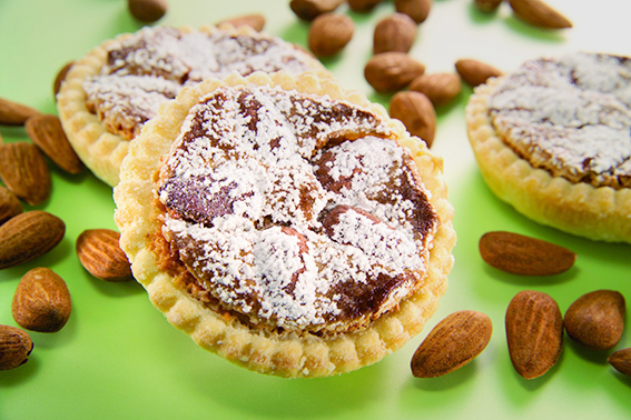 Zutaten für den Kuchenteig mischen und kurz im Kühlschrank abstehen lassen. Teig 1,75 bis 2,0 mm ausrollen und mit gezacktem Ausstecher 130 Aluförmchen von 7 cm (25 g Teig) auslegen. Leicht stupfen und bis zur weiteren Verarbeitung im Tiefkühler lagern. Danach Zutaten für Schneemasse zu Schnee schlagen. Butter und 150 g Staubzucker schaumig rühren. Eigelb nach und nach beigeben. Danach Schneemasse darunter mischen und anschliessend gemahlene Mandeln, Bittermandeln und Zucker fein reiben und zusammen mit dem Mehl unter die Masse mischen. Pro Förmchen je 20 g einfüllen. 5 rohe Mandeln auflegen und mit Staubzucker stauben. Im milden Ofen bei offenem Zug backen.