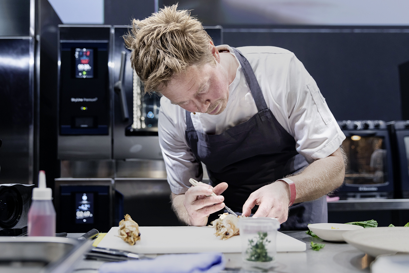 Oh yeah», sagt Søren Selin, als er das Brötchen ins heisse Öl tunkt. Das frittierte Brötchen serviert er zu handgetauchten Jakobsmuscheln und Spargeln – für einmal nicht in seinem Restaurant AOC in Kopenhagen, sondern am International Cooking Summit Chef Alps in Oerlikon/ZH. Mit dem «AOC» behauptet sich Selin seit sechs Jahren im kulinarischen Haifischbecken der dänischen Hauptstadt. Und das äusserst erfolgreich: Dreimal gewann er die Auszeichnung für das beste Gericht des Landes und er kochte sich 2015 den zweiten Stern. Das Restaurant befindet sich im Keller einer historischen Villa mitten in der Altstadt und der Name AOC (Appellation d’Origine Contrôlée) steht gemäss Søren Selin dafür, «das Richtige am richtigen Ort zu tun».