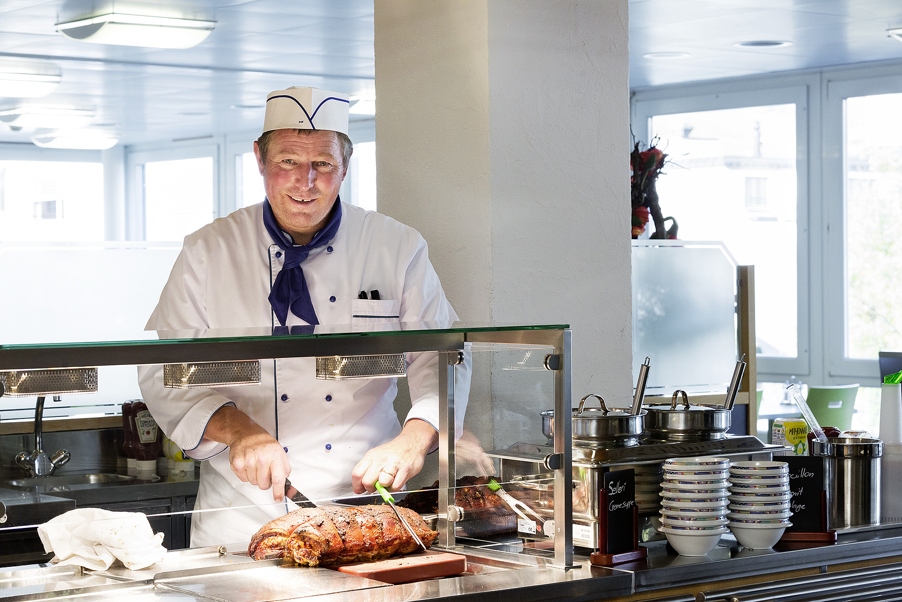 Dix personnes travaillent à la chaîne pour préparer commande après commande, et ceci avec environ 25 régimes différents, du régime complet au léger, en passant par le régime enrichi. Cela se calme. On n’entend que le cliquetis des assiettes et des couverts, des louches qui s’agitent et des commentaires tels que «le dessert et la salade sont sans noix», «la soupe est enrichie» ou «la poivronnade est sans sel» – toutes des informations pertinentes pour le chef de cuisine qui vérifie pour finir tous les menus à la fin de la chaîne, avant qu’ils ne soient amenés dans le chariot à plateaux dans les étages. La tension de l’équipe ne se relâche qu’avec le dernier menu de patient. Pour Berhard Schachtner, il n’y a toutefois pas de répit. Il est l’heure de la distribution des repas au restaurant. Le chef de cuisine sert en personne les collaborateurs et les hôtes au restaurant. Il n’est pas étonnant que la bonne cuisine de l’hôpital soit appréciée partout.