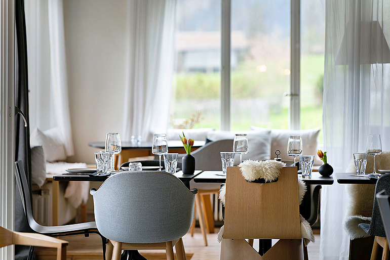 Als sich das Ehepaar auf dem Hotelimmobilienmarkt umsah, hatte es keine Eile, etwas Passendes zu finden. «Wir hatten beide tolle Jobs im Hotelbusiness, die wir nur kündigen wollten, wenn wir das Richtige gefunden hätten», so Raphael Simcic. «Bei der Lenk Lodge hat die Hardware auf den ersten Blick gestimmt.» Dieses für die Region typische Haus mit überraschendem Interieur hat das Paar im ersten Jahr einem Fine Tuning unterzogen. Dies vor allem im Erdgeschoss mit seinem Aufenthaltsbereich, der sich wie ein grosses Wohnzimmer präsentiert. Dort gibt es gemütliche Sitzgelegenheiten an Tischen und in der Lounge. Morgens wird hier das Frühstück serviert, abends verwandelt sich der grosse Raum ins vegetarische Restaurant LUH, in dem auch das Feuer im Cheminée entfacht wird. Und wer tagsüber einen Snack oder ein Getränk möchte, kann sich an der Honesty Bar bedienen, einem Kiosk mit Kühlschrank. «Es gibt Hotelgäste, die ein paar Tage bei uns sind, ohne dass sie das Haus verlassen. So wohl fühlen sie sich», weiss Simcic. Es kommen sowohl Individualgäste als auch Gruppen, vorab solche, die eine Unterkunft für ihre Yoga-Retreats suchen.