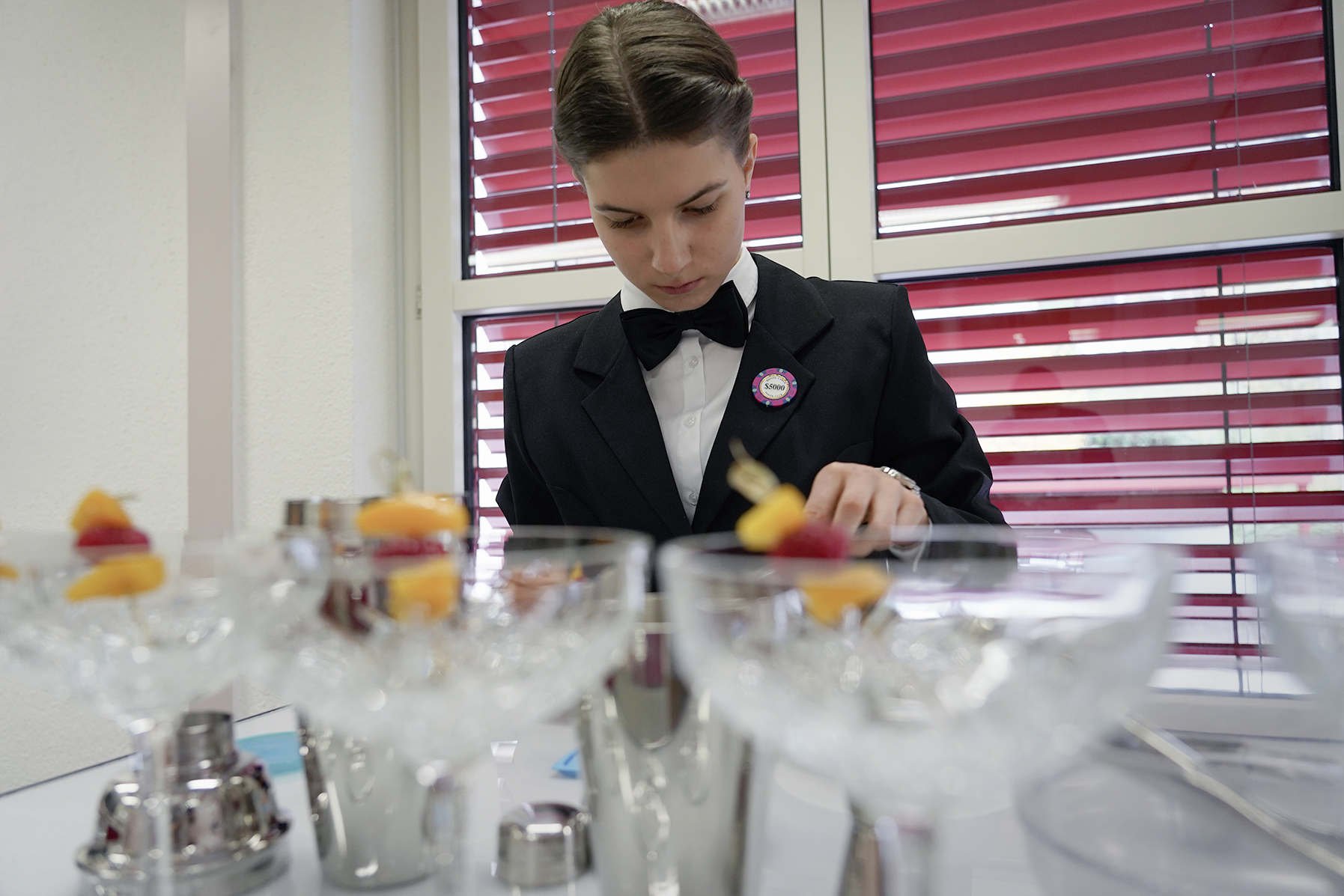 Vergangenen Samstag war es so weit: Insgesamt elf Finalistinnen und Finalisten aus Küche und Service traten in den Räumlichkeiten der Hotel & Gastro Formation in St. Gallen gegeneinander an. Die Serviceprüfung bestand aus drei Teilen: Tisch aufdecken, «Mise en place Bar» sowie Service. Um den Tisch für vier Personen zu decken, hatten die Teilnehmenden 60 Minuten Zeit, für das Mise en place Bar 30 Minuten und für den Service 150 Minuten.