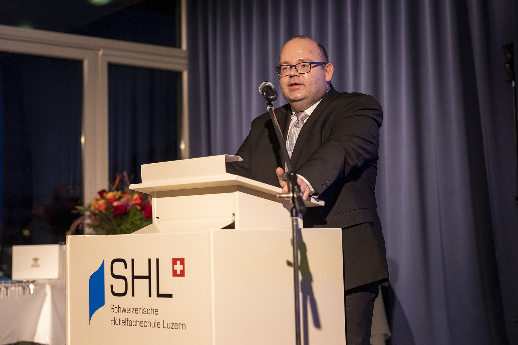 Als erster Redner der Diplomfeier gratulierte Regierungsrat Dr. Armin Hartmann den Abschlussklassen und würdigte ihre Leistung mit einer engagierten Rede. Er hob die Stärke des dualen Bildungssystems im Allgemeinen und der SHL als Höhere Fachschule im Besonderen hervor. Der Bildungsgang, so Hartmann, «besitzt eine hohe Reputation» und «vermittelt Kenntnisse und Kompetenzen, die im Markt gebraucht werden». Die Ausbildung an der SHL sei nicht nur ein Sprungbrett für Karrierechancen, sondern auch ein Garant für praxisnahes Wissen und nachhaltigen Erfolg. Mit Blick auf die Branche unterstrich er deren gesellschaftliche Relevanz: Tourismus und Hospitality seien «wichtige Pfeiler moderner Standortförderung», unterstützen den kulturellen Austausch und stärken das gegenseitige Verständnis. Zum Abschluss gab er den Absolventinnen und Absolventen mit, dass sie – ganz egal, ob sie in der Schweiz oder irgendwo auf der Welt ihre Karrieren fortsetzen – mit einem wertvollen Schatz starten: «Mit Wissen und Können, Erfahrung, Gemeinschaft und mit der Fähigkeit, in einer der dynamischsten Branchen der Welt bestehen zu können.»