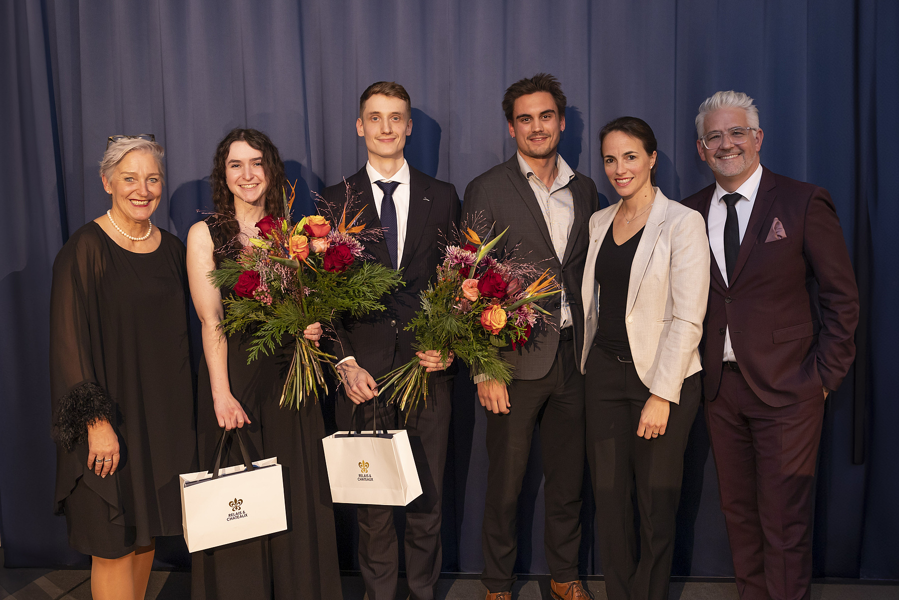 Natürlich erhielten auch die Abschlussklassen die Gelegenheit, sich an die Anwesenden zu wenden. Nach einer charmanten Einstimmung durch Lorin Ziroldo folgte ein schon fast poetischer Beitrag in Reimform: Julian Brunner, Jeannelle Niquille und Josef Grüner präsentierten die gemeinsame SHL-Reise – gespickt mit humorvollen sowie emotionalen Anekdoten über besondere Momente, anspruchsvolle Studienphasen und bleibende Freundschaften: «Gemeinsame Erlebnisse, vom Klassenzimmer bis zur letzten Nacht, haben aus einer Klasse eine Crew, ja, gar Familie gemacht.» Mit viel Wortwitz, der etliche Schmunzler auslöste, zeigten sie nicht nur, was sie in den vier schulischen und drei praktischen Semestern erlebt haben, sondern auch, welche Erwartungen und Pläne sie für die Zeit nach der Diplomierung hegen. Ihr Auftritt liess das Publikum an der intensiven Studienzeit teilhaben und spiegelte die Verbundenheit innerhalb der Klassen und mit der SHL wider – auf den Punkt gebracht durch Josef Grüner: «Egal wohin der Wind uns trägt, ein Stück SHL reist mit – etwas, das prägt.»