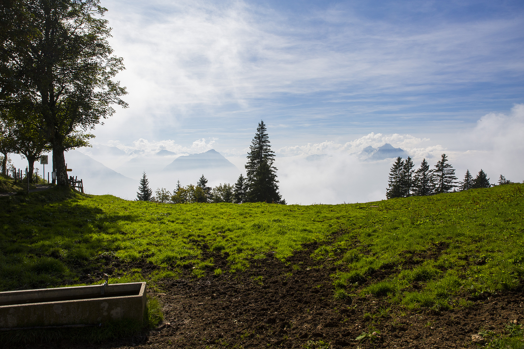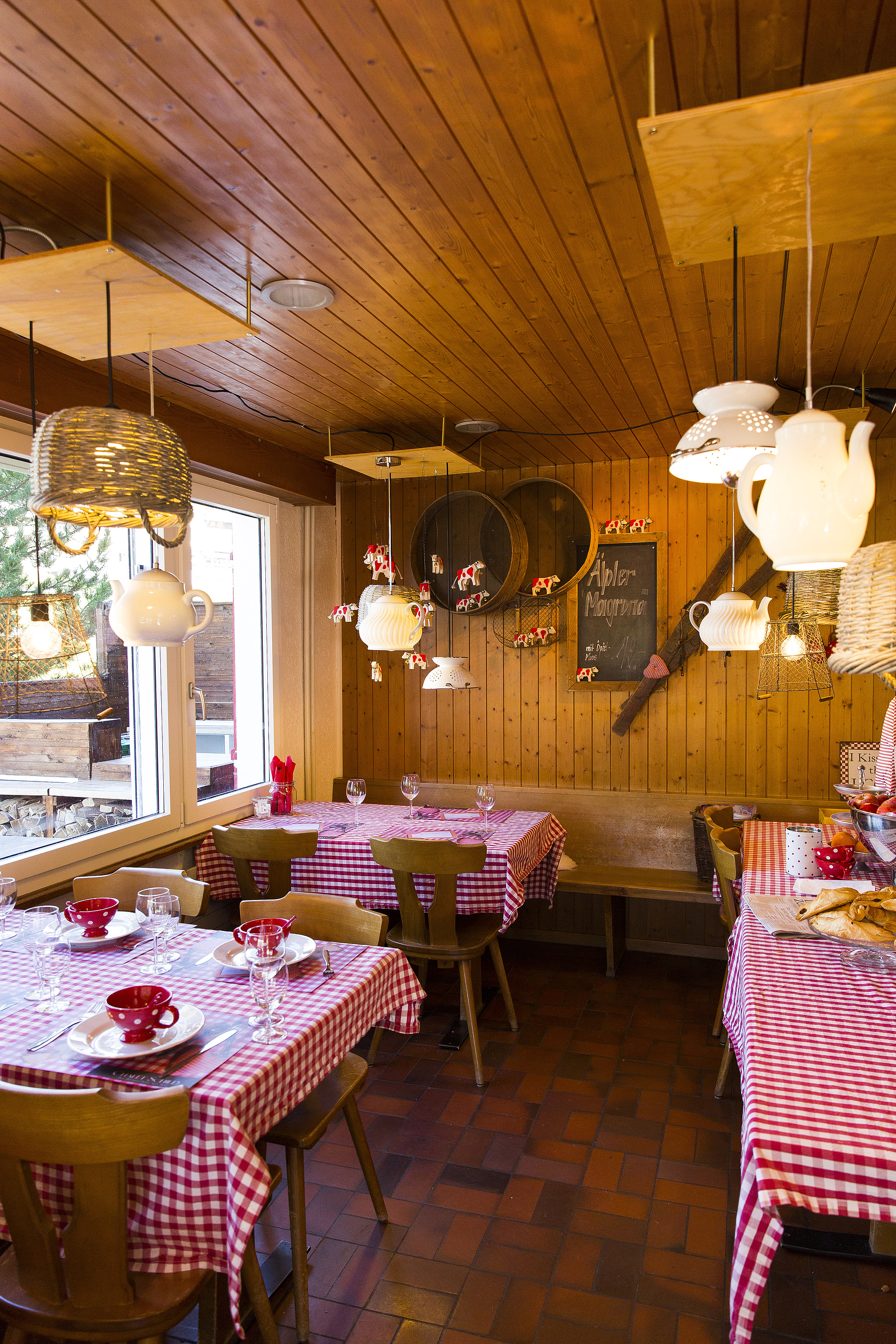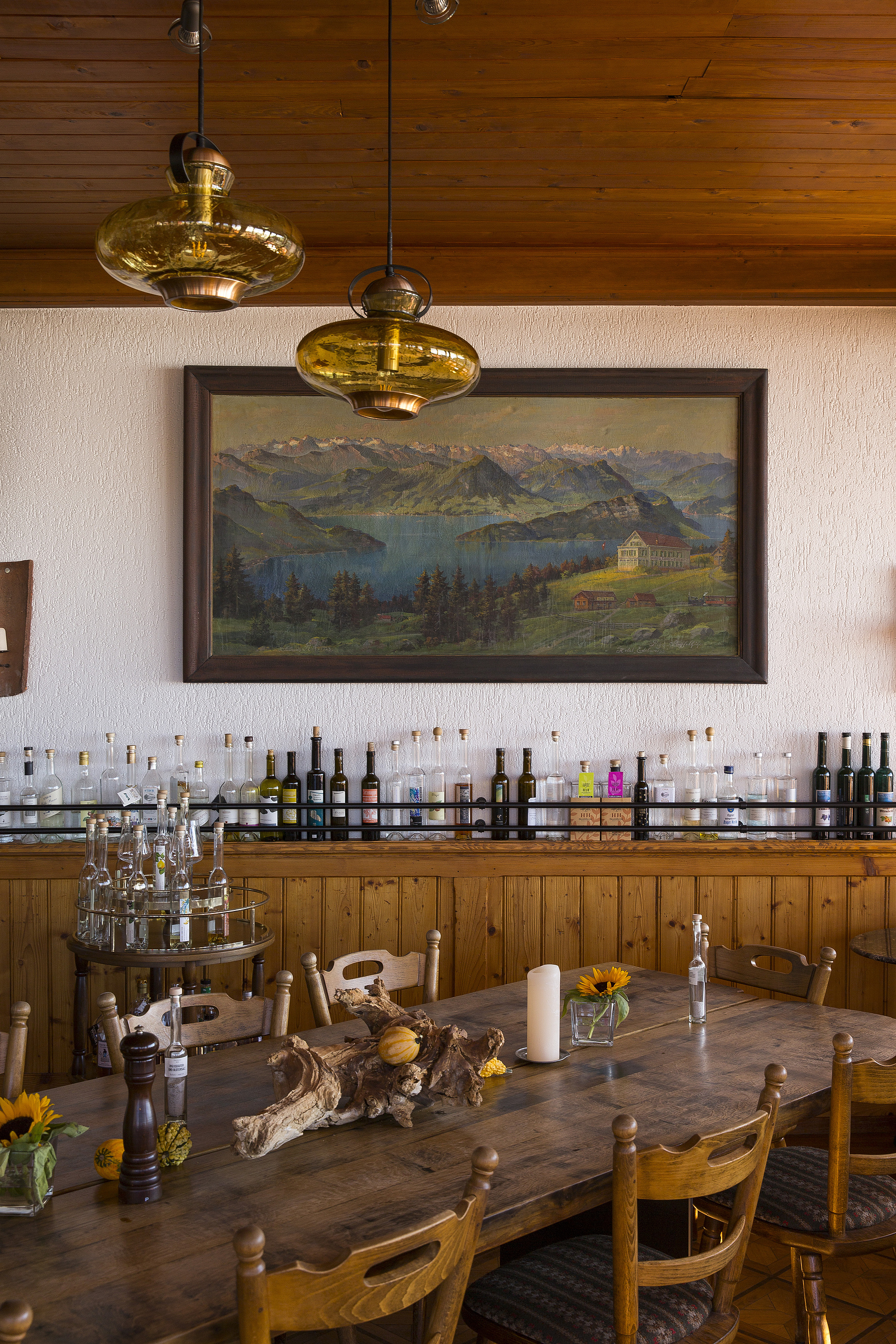 Bis dahin verwöhnt er seine Gäste über Mittag weiterhin mit Gerichten aus einer kleinen, aber feinen Karte. «Wir machen alles selbst, legen grossen Wert auf Details und warten immer mit etwas Unerwartetem auf. Seien dies ein feines Karamell zum Kaffee, eine Dekoration, die selbst vor halben Kühen und fliegenden Wasserkrügen nicht Halt macht oder einer Hochbeet-Lounge. Saisonal und regional stehen Pflaumenwähen und Maronisuppe mit Haldihof-Gin-Sorbet an. Abends öffnet der Kulinariker seinen Betrieb auf 1452 Metern über Meer für Gruppen von mindestens zehn Personen oder natürlich, wenn Gäste die Zimmer im oberen Stock belegen. Dann schöpft er aus dem Vollen und bietet eine grosszügige Tavolata an.