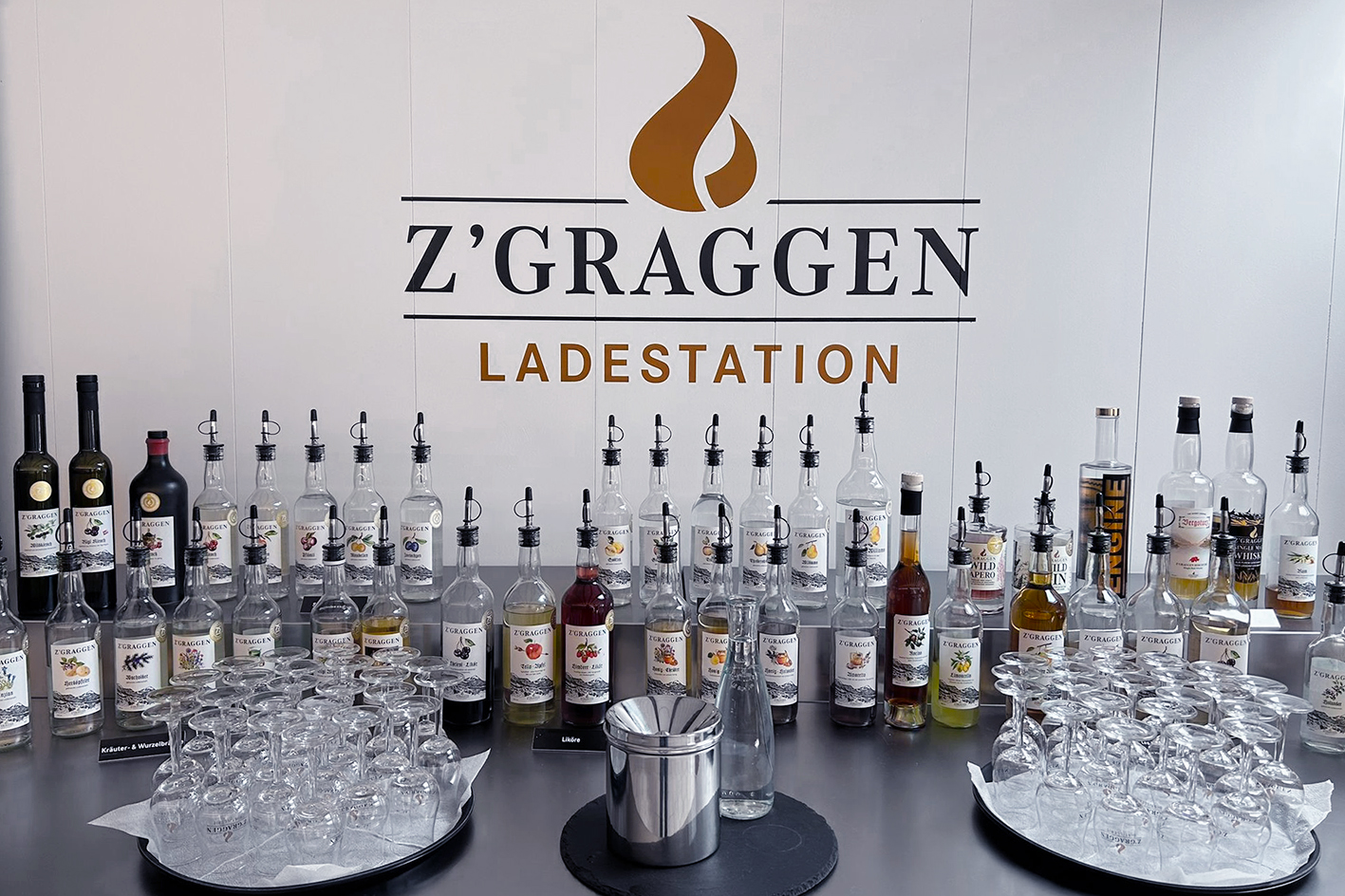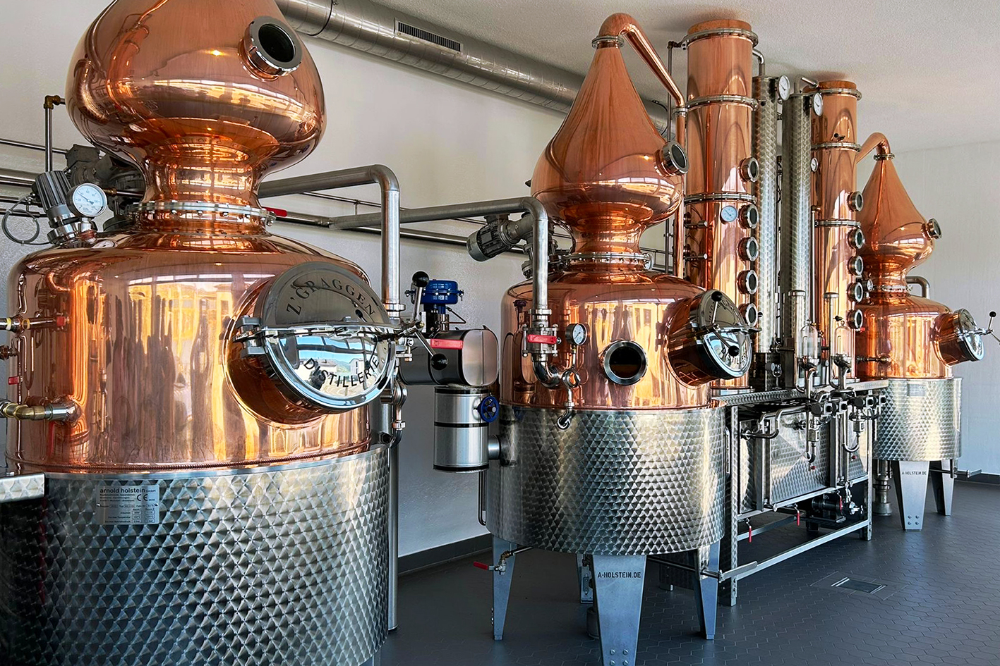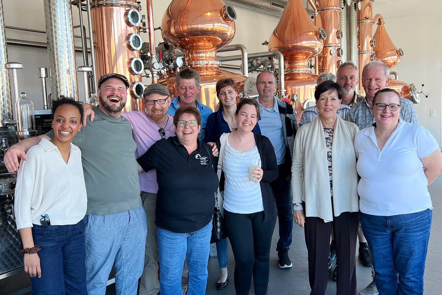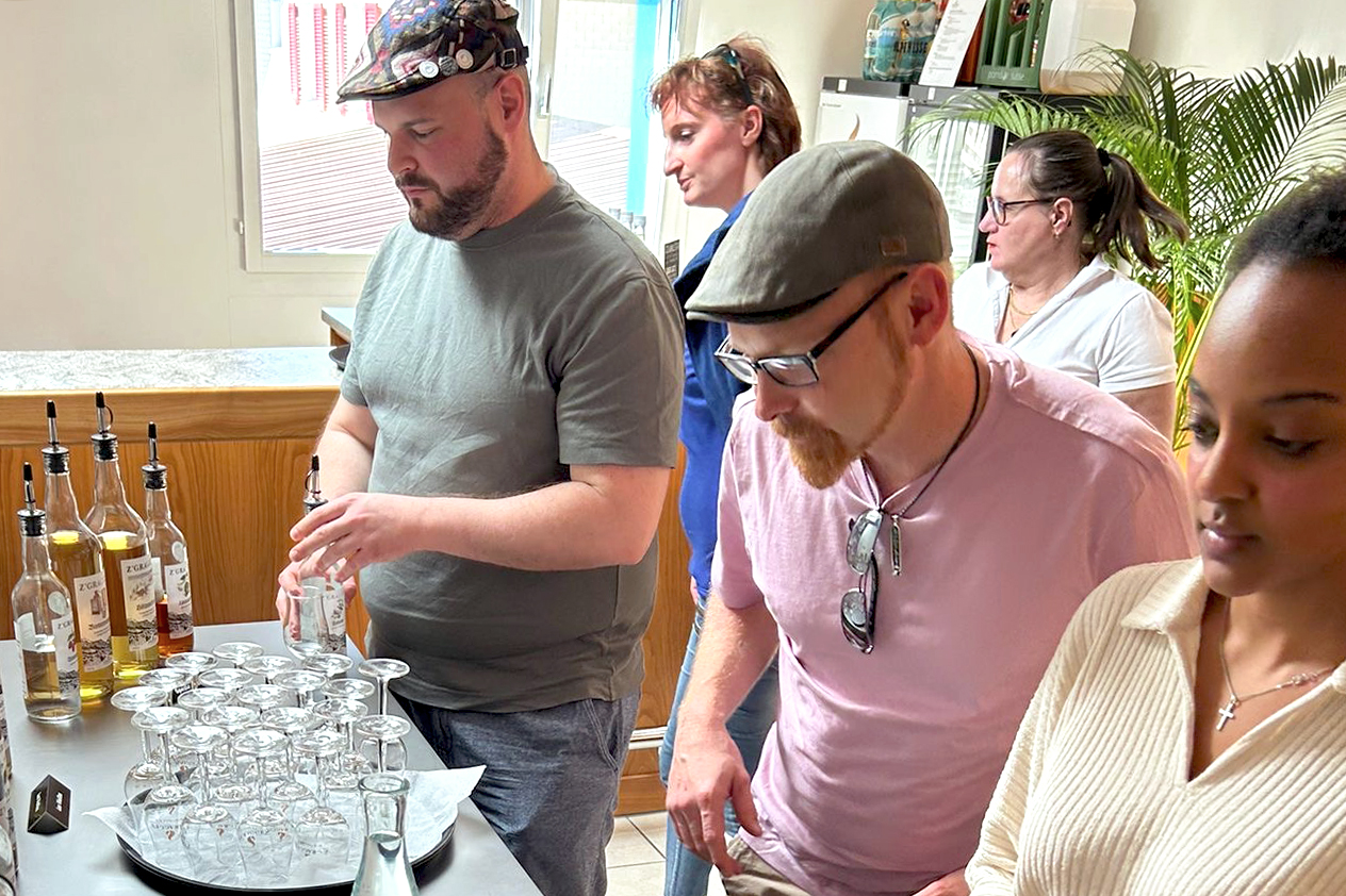 Im Eventraum wurde der Gruppe ein erster Cocktail serviert – kreiert von Hasi Ott von der «Rütlibar» in Brunnen/SZ, Präsident der Swiss Barkeeper Union. Anschliessend folgte eine Degustation verschiedener Destillate, darunter der Honigkräuter. Weiter führte der Rundgang zur Abfüllanlage mit einer Kapazität von bis zu 600 Flaschen pro Stunde sowie zu den Lagertanks mit Halbfabrikaten und sortenreinen Destillaten. Den Abschluss bildete die Brennanlage mit ihren Kupferbrennblasen, die wöchentlich auf Hochglanz poliert werden.