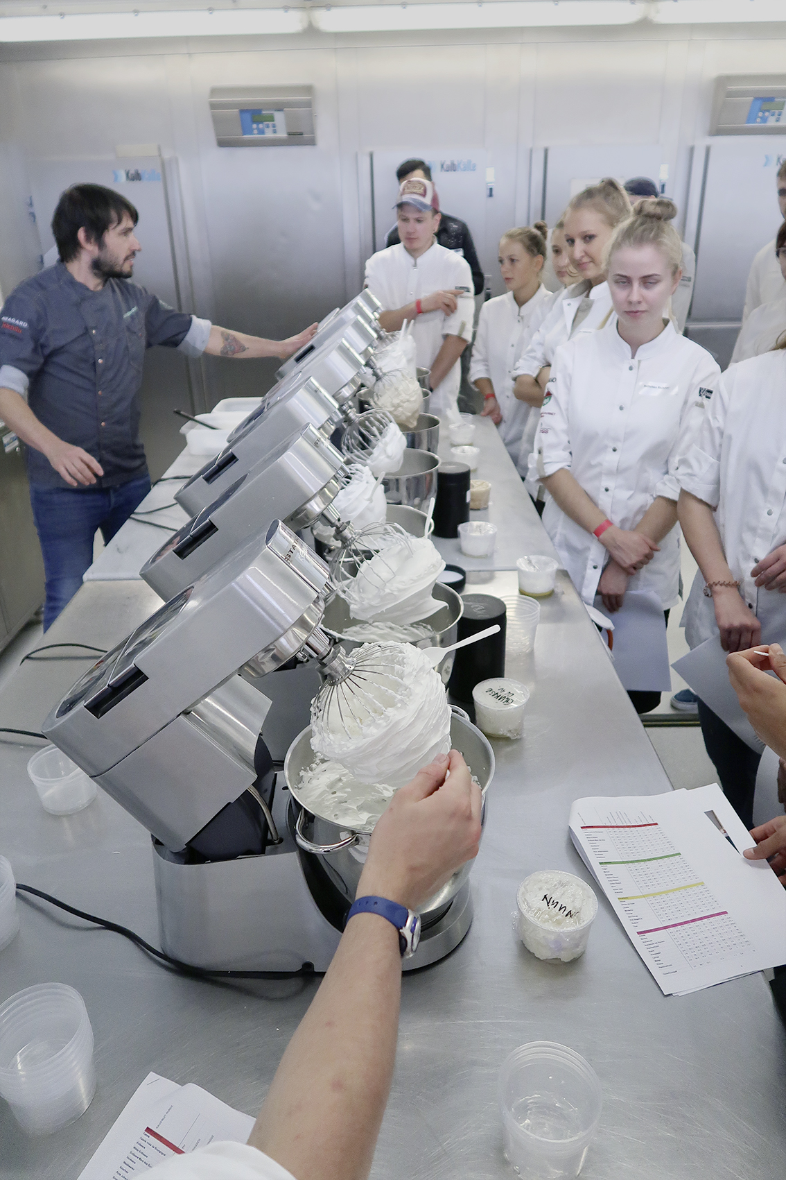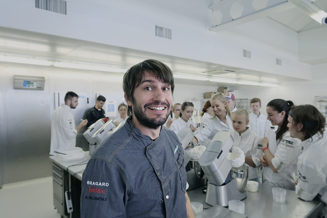 Stefan Bischof ist Inhaber und Chef pâtissier des Café g’nuss in St. Gallen. In seinem Betrieb arbeitet er nach der B-Concept-Methode, entwickelt vom spanischen Pâtissier-Weltmeister Jordi Bordas. Nach dieser innovativen Methode können süsse Kreationen mit weniger Zucker und Fett hergestellt werden – ganz ohne Geschmacksverlust. Wie das funktioniert, hat Stefan Bischof den Teilnehmenden auf anschauliche Weise erklärt. In sechs Rührwerken hat er Wasser, Eiweisspulver und verschiedene Süssstoffe aufgeschlagen. Das Ergebnis war beeindruckend. Während einer Stunde konnte Stefan Bischof jedoch nur an der Oberfläche des umfangreichen Themas kratzen. Wie verändert sich der Geschmack eines Creamy, wenn statt Zucker Glukose oder Kokosblütenzucker verwendet wird? Wie verändert sich die Konsistenz? Und warum gilt Johannisbrotkernmehl als gute E-Nummer? Die jungen Berufsleute erfuhren einige Grundsätze zum B-Concept. «Ich hoffe sehr, dass sich viele in Zukunft mit diesem einzigartigen Konzept der Zuckerreduktion auseinandersetzen», sagt Stefan Bischof. Denn Zucker und dessen Einfluss auf die Gesundheit werden seit langem heiss diskutiert – und wer verzichtet schon gerne auf Süsses?