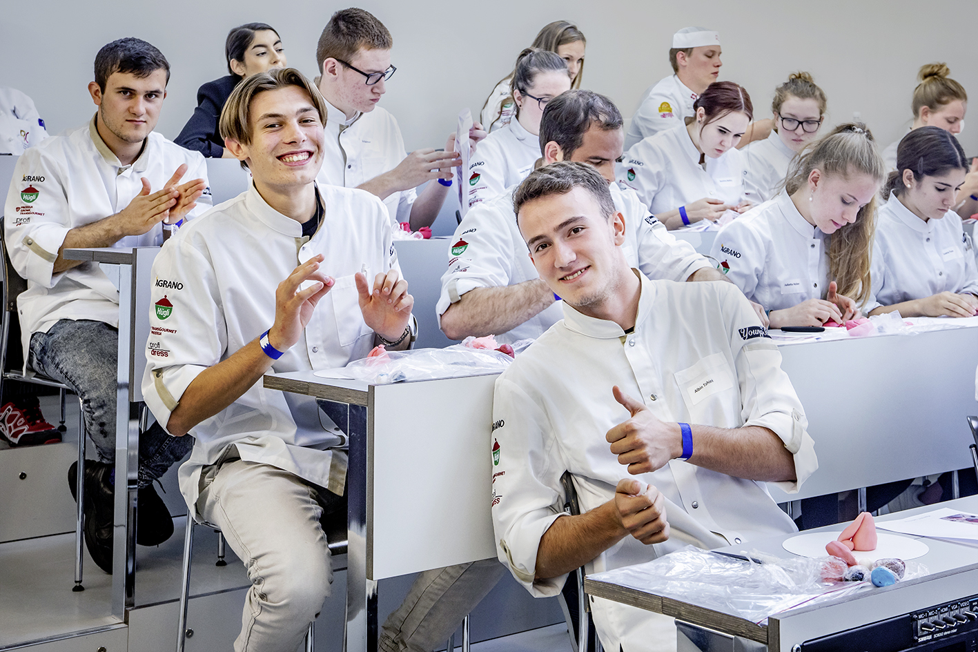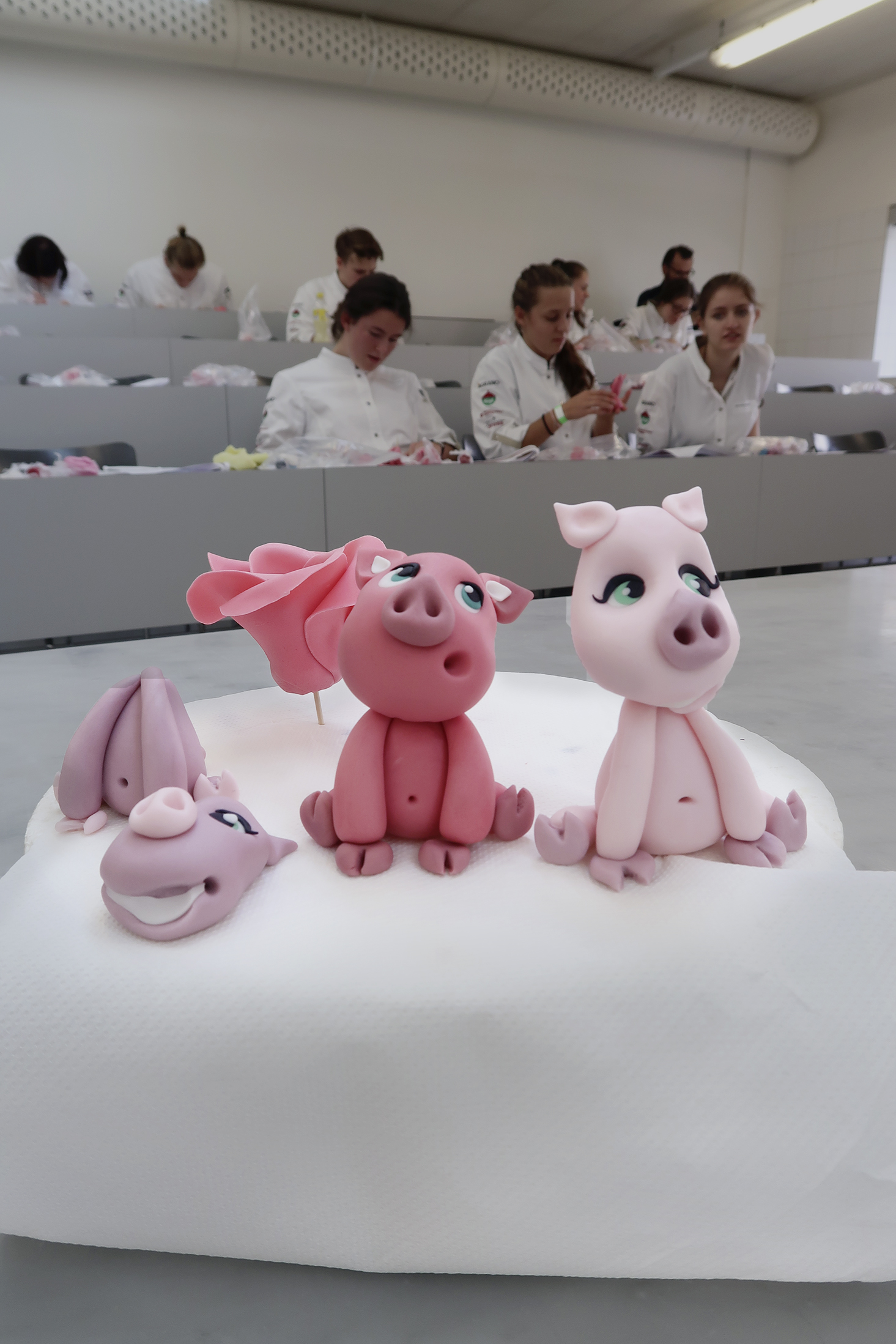 Sara Hochuli ist gelernte Grafikerin, hat eine süsse Seite und führt in Zürich das von Japan inspirierte Café Les Gourmandises de Miyuko. Seit zehn Jahren selbständig, gestaltete sie eine Uhr für Swatch, designt Perücken aus Plastikhaar und entwickelte für die Basler Confiserie Beschle Matcha-Schokolade. Ihre Torten entwirft sie auf Papier. «Ein Dekor zu zeichnen, dauert mitunter länger, als die Torte zu backen und zu dekorieren», sagte die Tortenkünstlerin. Im Young-Star-Workshop zeigte sie den Teilnehmenden, passend zum chinesischen Jahr des Schweins, wie mangainspirierte Schweinchen mit verschiedenen Gesichtsausdrücken modelliert werden. Sara Hochuli gab den Jungtalenten Tipps und zeigte ihnen Tricks. So erklärte sie etwa, dass der Kopf nicht zu gross sein darf, da er sonst runterfällt oder welche Werkzeuge sich zum Modellieren am besten eignen. «Man muss sich erst mit dem Material anfreunden, und dann kann man seinen eigenen Stil finden», sagte Sara Hochuli. Das Endergebnis liess sich durchaus sehen und man merkte, wie viel Kreativität in den angehenden Berufsleuten steckt. Jede Teilnehmerin, jeder Teilnehmer, durfte sein Schweinchen als Erinnerung mit nach Hause nehmen.