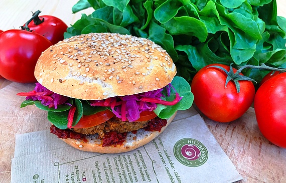 Burger-Brötchen, Sauce, Gemüse und ... Mehlwürmer. Hitzberger traut sich an den Insekten-Trend.