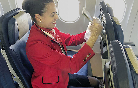 Eine Flugzeugkabine, zwischen sechs und zwölf Reinigungsmitarbeitende und 50 Minuten Zeit. Da muss jeder Handgriff sitzen.