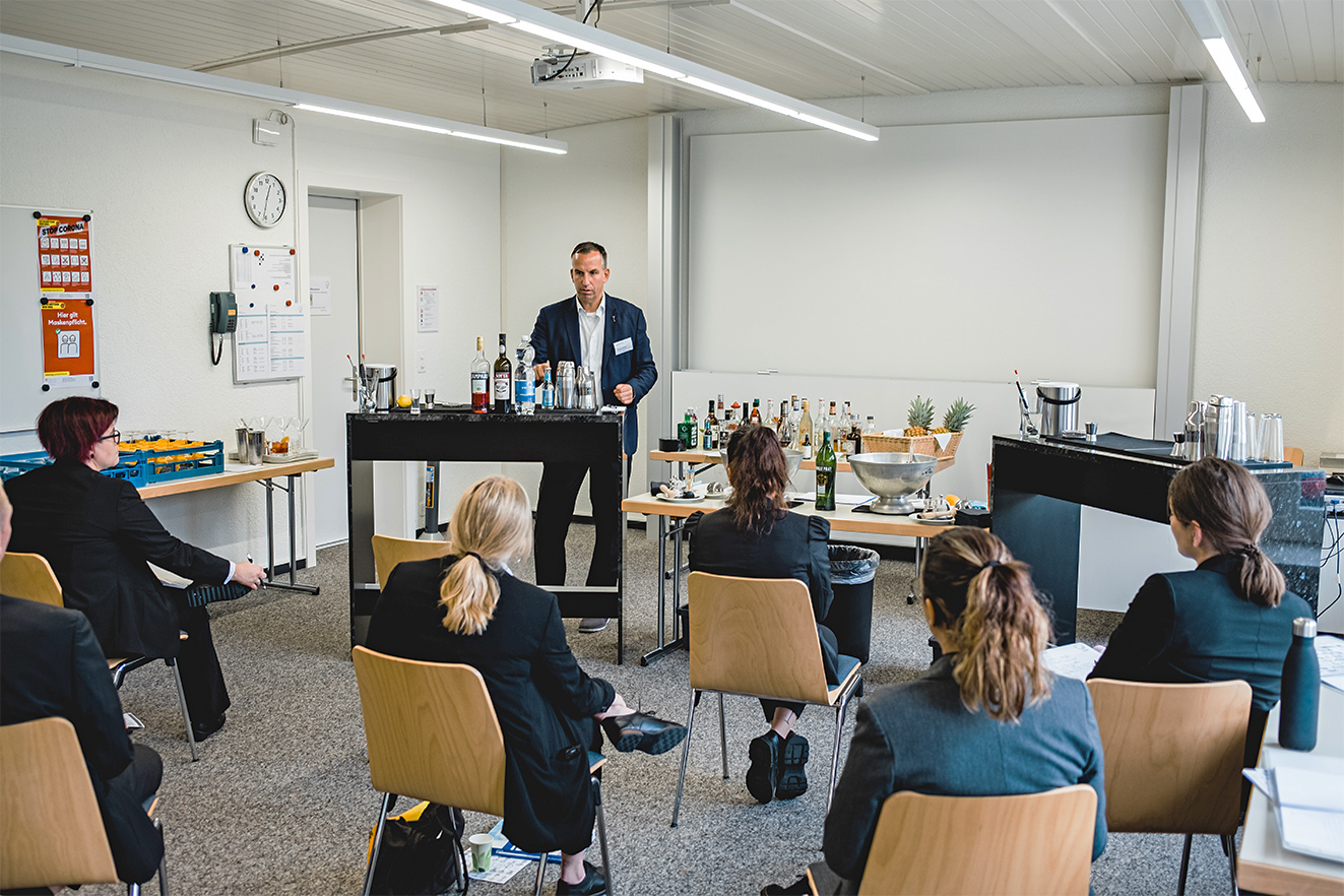 Um die Qualität des Kurses zu garantieren, wurde das Programm etwas umstrukturiert und die Teilnehmenden in drei Gruppen eingeteilt. So konnte noch individueller auf die Bedürfnisse der Einzelnen eingegangen werden, und in der Barschulung von Thomas Huhn, Chef de bar im Fünfsternehotel Les Trois Rois in Basel, konnten noch mehr Cocktails gemixt werden. Unter den Augen des versierten Fachmanns wurden Gin Fizz, Negroni, Piña Colada, B52 und Manhattan geübt. «Letzterer wird gerne an Prüfungen verlangt», verriet Thomas Huhn. Neben dem praktischen Teil gab der Chef de bar, welcher 25 Jahre in Spitzenhäusern rund um die Welt arbeitete, wertvolle Tipps: «Wenn ihr euch Routine in der Arbeitsweise aneignet, könnt ihr diese jederzeit abrufen.» Je besser die Mise en place, umso besser das Arbeiten. Er gehe jeden Tag von einer vollen Bar aus.
