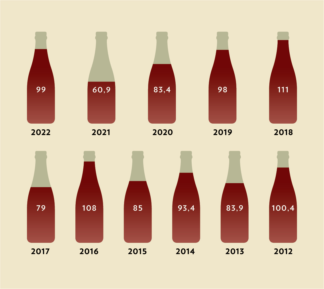 Im letzten Jahr wurden in der Schweiz 99 Millionen Liter Wein produziert. Gegenüber dem Vorjahr ist dies eine Zunahme um 63 Prozent. Zur Erinnerung: Die Weinernte 2021 war historisch gesehen die niedrigste seit 1957. Schwierige Witterungsbedingungen hatten je nach Region unterschiedlich ausgeprägte Auswirkungen. Die Zunahme im Vergleich zum Vorjahr variiert demnach je nach Region stark. In der Deutschschweiz wurden insgesamt 16 Millionen Liter Wein produziert, was einem Anstieg um 94 Prozent entspricht. In der Westschweiz waren es mit einem Erntevolumen von 78 Millionen Litern 63 Prozent mehr als noch 2021. In der italienischen Schweiz, im Tessin und im Misox, ist der Anstieg weniger ausgeprägt. Dort fiel die Ernte mit insgesamt fünf Millionen Litern um acht Prozent höher aus.