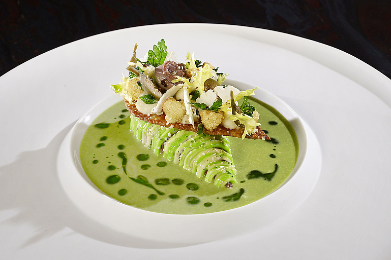 Ringeltauben-Vitello an säuerlicher Petersiliensauce, Blumenkohlstückchen und Kapernblüte. (Pierre-Michel Delessert)