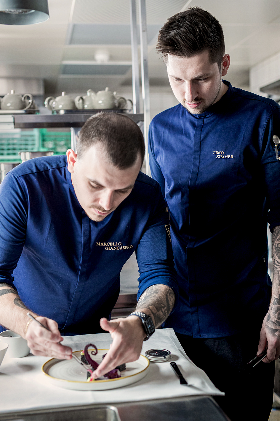 Weiter geht es in das Fünfsternehaus Walliserhof, wo Küchenchef Timo Zimmer die Gäste im Gourmet-Restaurant Cäsar Ritz verwöhnt. Der 27-jährige Hamburger arbeitete in seiner Heimatstadt unter anderem im «Fairmont Vier Jahreszeiten» und hat das «Fontenay» an der Aussenalster miteröffnet. «Wir sind überzeugt, dass Nachhaltigkeit und ein respektvoller Umgang mit der Natur schon auf der Einkaufsliste beginnen. Nur so entsteht wahre und bewusste Gaumenfreude auf dem Teller», sagt der Küchenchef. Auf dem Menü stehen beispielsweise Rinderbacke mit Rosenkohl, Tessiner Polenta und weissem Speck oder Lamm mit schwarzem Knoblauch, Topinambur, Urkartoffel und Tonkabohne. Auch eine Essigdegustation mit Produkten vom bekannten deutschen Weinessiggut Doktorenhof wird im «Walliserhof» angeboten. Diese soll nach dem Hauptgang stimulierend auf den Magen wirken, die Geschmacksnerven sensibilisieren sowie Freiraum für das Dessert schaffen.