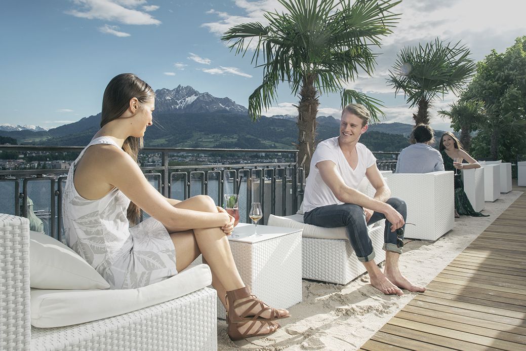 Beim anschliessenden Umtrunk in der Beach Lounge des Hotels Montana mit Blick über das Luzerner Seebecken und den Vierwaldstättersee bleibt genug Zeit für individuelle Gespräche mit Mitarbeitenden der Hotel & Gastro Union, des Art Deco Hotels Montana und der SHL.