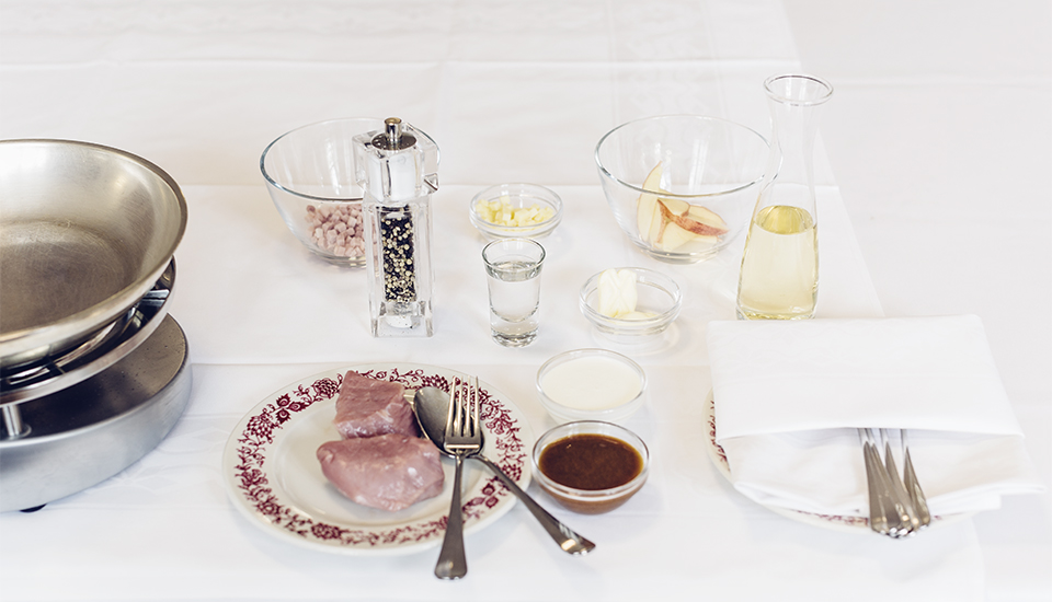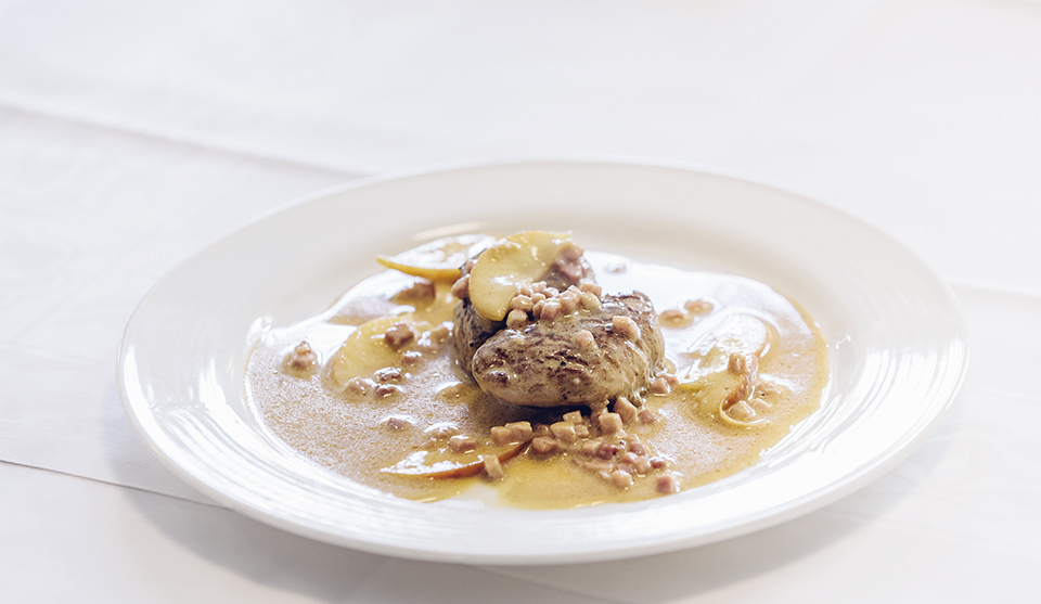 5–6 Déposer le reste du beurre dans la poêle, ajouter les tranches de pomme, le jambon et le fromage, puis déglacer avec le vin. Ajouter la demi-glace et la crème. Porter rapidement à ébullition, assaisonner la sauce, y déposer les médaillons, les laisser chauffer un peu et servir.