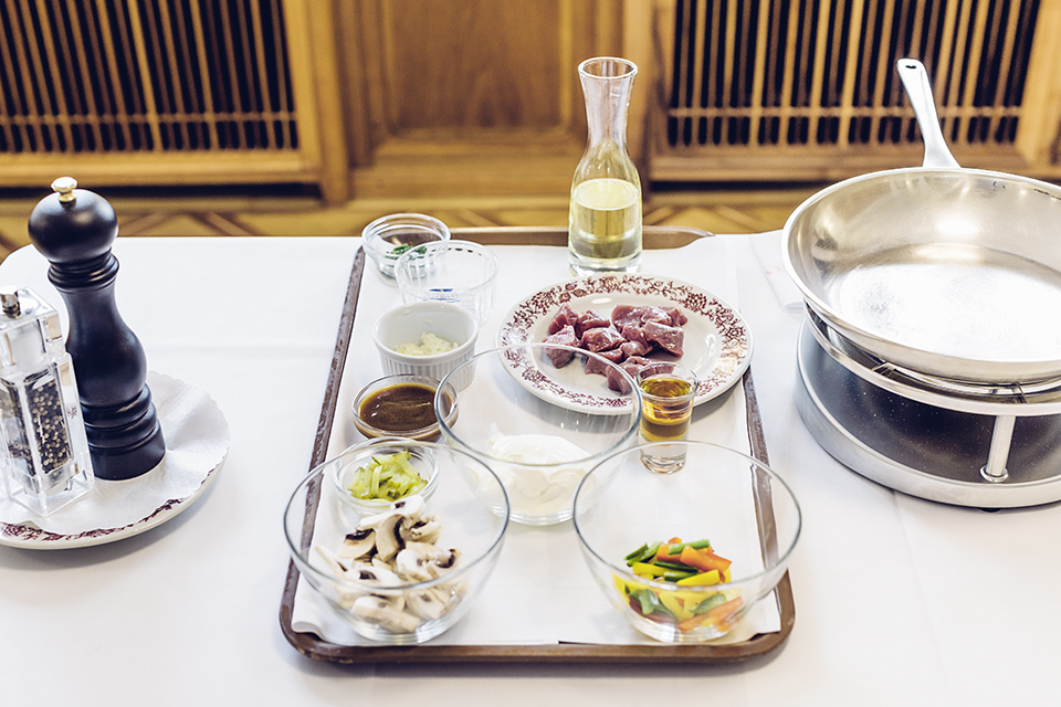 3 – 4 Verser le kirsch dans la poêle. Pencher la poêle en direction du réchaud et faire passer la flamme dans la poêle avec un geste élégant de la main. Faire bouger un peu la poêle pour que la flamme soit plus grande. Une fois la flamme éteinte, retirer la viande de la poêle et la réserver au chaud.