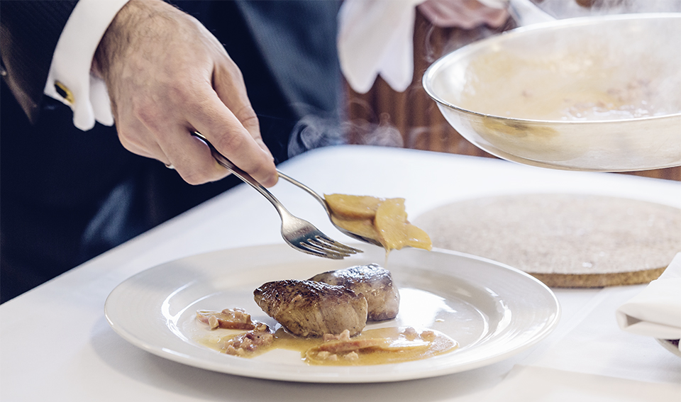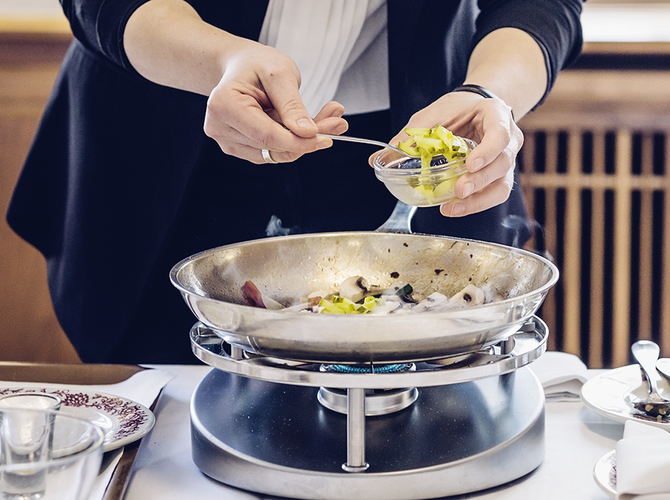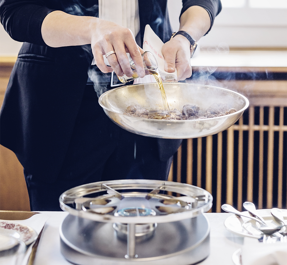 Aujourd’hui, il semblerait que les clients soient à nouveau disposés à patienter pour bien manger, si bien que le tranchage et le flambage en salle font un come-back remarqué. Claudia Dünner, directrice de la Société professionnelle de la restauration (spr) s’en félicite: «Le flambage est très efficace en termes de marketing et il contribue à faire augmenter le chiffre d’affaires. Les clients apprécient le spectacle et plébiscitent la saveur des mets flambés. De plus, il incite les autres clients à commander eux aussi un plat flambé, soit tout de suite, soit lors de leur prochaine sortie au restaurant.»