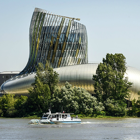 Comme tout le monde, j’ai payé mon ticket 20 euros sur Internet, avec un créneau horaire réservé. C’est par là que commence la visite «branchée». Le bâtiment a fait jaser: planté entre le pont levant Jacques Chaban-Delmas et le pont d’Aquitaine, rive gauche de la Garonne, il évoque le musée Guggenheim de Bilbao. Mais là où Frank Gehry offre des structures éclatées, Anouk Legendre et Nicolas Desmazières, du bureau parisien XTU, ont «emballé» de rondeurs alu une charpente en bois lamellé-collé, souvent fort belle à voir… de l’intérieur. Le bâtiment, haut comme un gratte-ciel de vingt étages, rappelle une carafe ventrue. Il est intimement lié au fleuve, d’où partaient les tonneaux de bordeaux: on peut y arriver du pont de pierre ou du quai des Chartrons en bateau-navette… plutôt qu’en tram (arrêts pile au bon endroit).