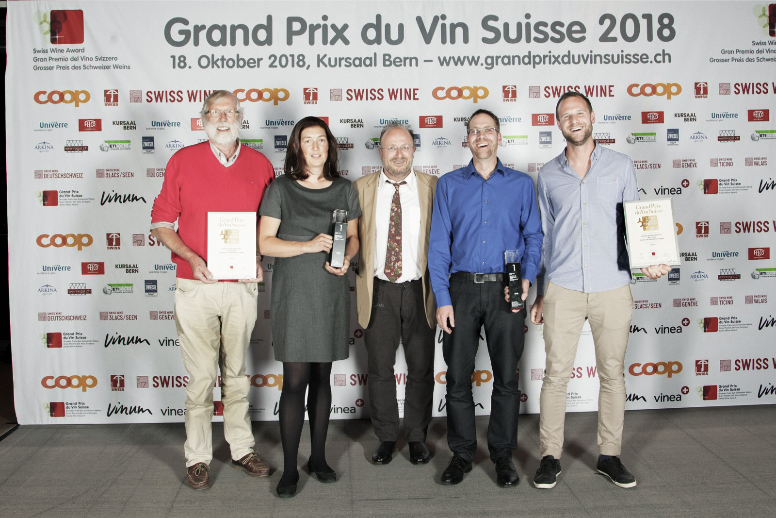 Normalerweise steigt die Spannung zum Ende der Gala des Schweizer Weins ins Unermessliche. Dann nämlich warten alle Gäste auf die Bekanntgabe des «Weingut des Jahres». Anfänglich war dies auch bei der zwölften Ausgabe, die Mitte Oktober im Berner Kursaal stattfand, nicht anders. Wie jedes Jahr werden an der Gala die Sieger des Grand Prix du Vin Suisse bekannt- gegeben und der Anlass gilt als krönender Abschluss des Weinjahres. In 13 Kategorien mit je sechs Nominierten werden Pokale für die Ränge eins, zwei und drei vergeben. Die Viert- bis Sechstplatzierten erhalten Applaus und Diplome. In der Kategorie «Andere sortenreine Weissweine» wird Diego Mathier aus Salgesch/VS ein erstes Mal auf die Bühne gebeten. Mit seinem Heida Les Pyramides 2016 AOC Valais gewinnt er vor drei Petite Arvine, einem Viognier und einer Scheurebe. In der Kategorie «Weisse Assemblagen» holt er sich den ersten und den dritten Platz. Bei den Rosé-Weinen steht Diego Mathier erneut auf der Bühne. Bereits ist im Saal ein leises Murmeln zu vernehmen: Nouveau Salquenen, die Kellerei von Diego Mathier, wird wohl «Weingut des Jahres». Doch andere Winzer werden auch mehrmals auf die Bühne gebeten und die Formel ist kompliziert. Da geht es um die Anzahl zum Wettbewerb eingereichter Weine, um erhaltene Gold- und Silbermedaillen sowie um Nominationen und erste bis dritte Plätze. In der Kategorie «Rote Assemblagen» stehen Diego und seine Frau Nadja Mathier sowie Önologe und Kellermeister Cédric Leyat erneut an der Spitze. Die Cuvée route Rosmarie Mathier 2915 auf dem ersten Rang, darauf folgt Folissimo 2015 auf dem zweiten Platz. Damit hat sich die Spannung in nichts aufgelöst. Sämtliche Versuche von Moderator Sven Epiney, diese wieder anzuheizen, scheiterten. Trotzdem war der Jubel gross und der Applaus kräftig. Denn noch keinem anderen Schweizer Weingut ist das gelungen, was das Team um Nadja und Diego Mathier geleistet hat: Nach 2007 und 2011 werden sie 2018 zum dritten Mal «Weingut des Jahres». Als Zugabe sichern sie sich auch noch den Prix Vinissimo für den LieblingsWeisswein der Jury.